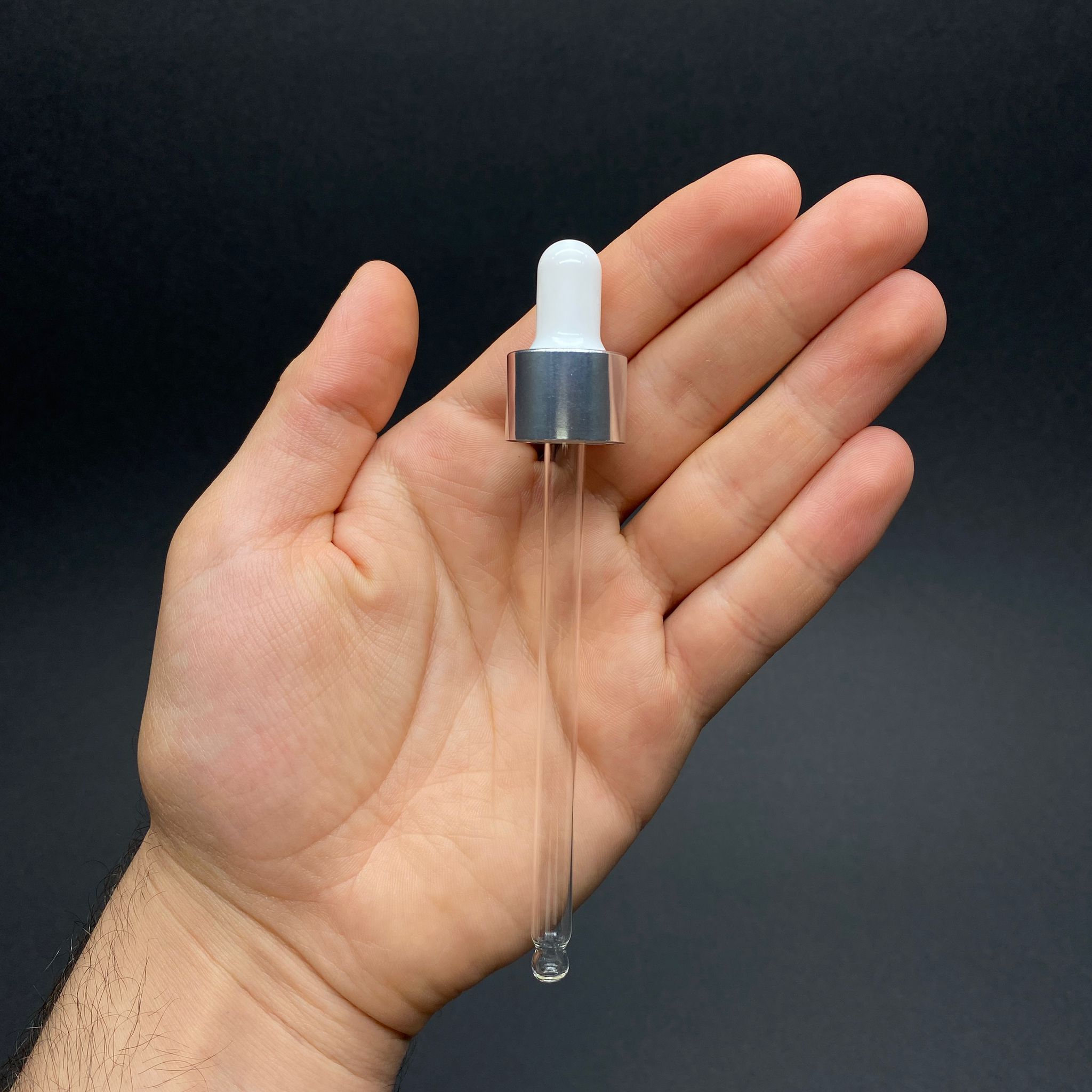 18 Mm Cam Damlalık Takım - Parlak Beyaz Emzik+Delikli Gümüş Metal Kapak+Cam Pipet - 100 Cc Dropper Şişeler İçin
