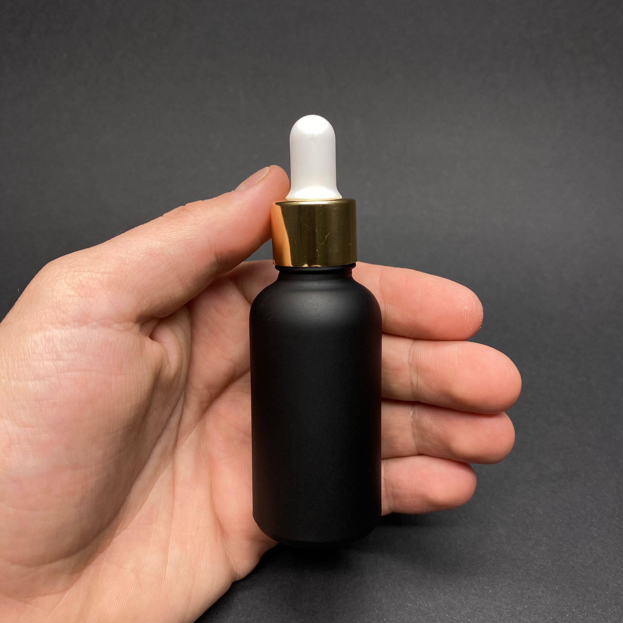 30 Cc Mat Siyah Boyalı Cam Damlalıklı Şişe, beyaz emzik ve gold metal kapak ile tamamlanan şık tasarımıyla dikkat çekiyor. 30 ml cam damlalıklı şişe, kullanım kolaylığı ve estetik görünümüyle öne çıkıyor. Bu şık şişe, parfümlerden yağlara, makyaj bazından serumlara kadar çeşitli sıvı ürünlerin saklanması ve uygulanmasında ideal bir seçenek sunuyor.