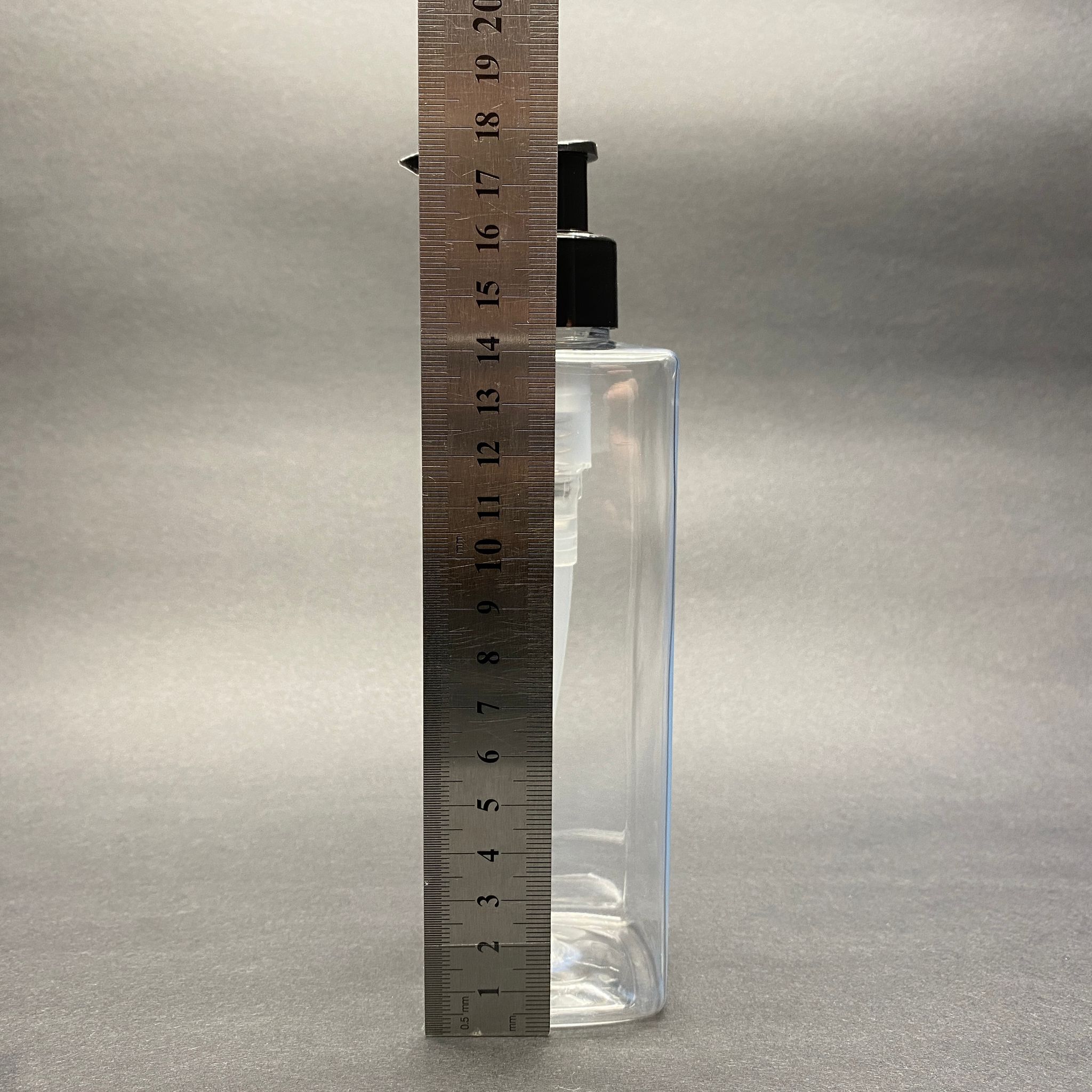 Bu 300 ml köşeli plastik şişe, kullanım alanlarınızı genişletmek için idealdir. 31 gram ağırlığındaki siyah pompalı kapağıyla pratik ve şık bir görünüm sunar. Gıda, kozmetik, temizlik ve endüstriyel alanlarda kullanıma uygundur.