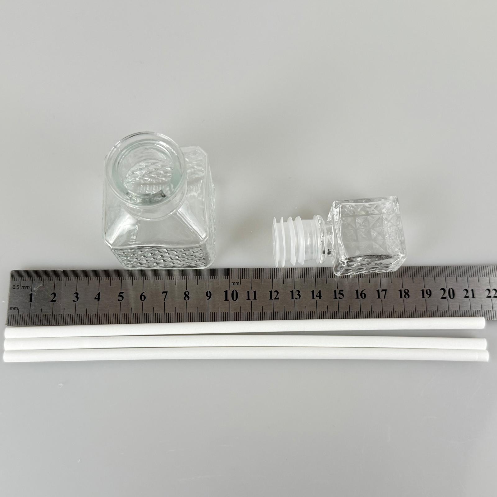 Kare Lüks Model Cam Bambu Oda Kokusu Şişesi + Cam Tıpa + 3 Adet Fiber Beyaz Bambu Çubuk - 50 Ml Set Takım - Hediyelik Promosyon Lüx Diffuser Şişeleri